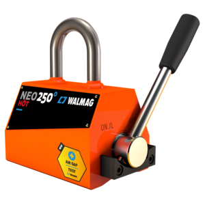 The THM Manual Magnetic Claw is used for transporting steel sheets horizontally and vertically, lifting plates from racks, pulling steel sheets out of shelving, as well as transporting flat pieces of magnetizable steel. The clamp, depending on the type, can be used for plate thicknesses from 1 to 5mm. Pressing down on the handle activates a cam which releases the magnetic claw from the workpiece. This manual claw is maintenance-free and keeps the magnetic force for an unlimited period of time.