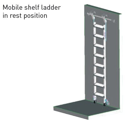 Algemeen: Verrijdbare stellingladder met railgeleiding en veer-belaste wielen voor het heen en weer rijden langs een stelling. Individueel qua hoogte aanpasbaar. Bij evt. bestelling de loodrechte hoogte van vloer tot bovenkant rail vermelden.